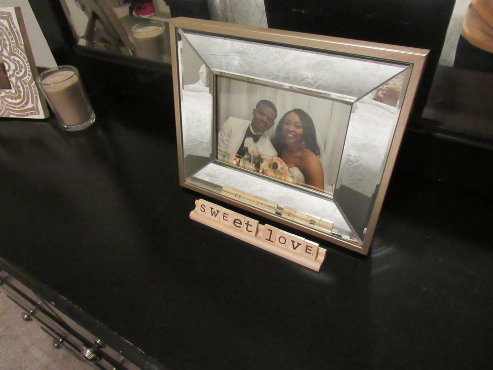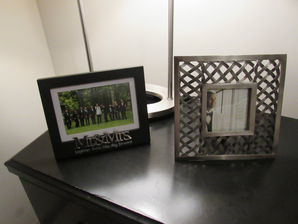 “S” is for Sweet: Ladies, when you get a new last name, flaunt it! It’s exciting. The printed, wooden “S” was found at TJ Maxx for about $6. You can’t beat that. Adding this to the wall over the bed contributes to the husband and wife vibe we wanted to create. Price:Wooden “S”, picture frames, acrylic ampersand and “You have my whole heart…” sign=$25.72