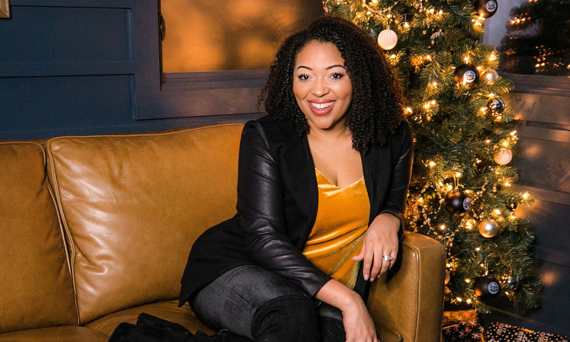 I met with an Evereve stylist, Annie Leech, and we curated the perfect looks for my own holiday festivities. Per tradition, my family always comes to Christmas dinner dressed to impress in casual looks. For my outfits, I rebelled against the typical red and green Christmas color theme and went for jewel tones. With outfit number one, this mustard yellow Sunday in Brooklyn velvet tank top gives all of the festive vibes of a Christmas light show! It’s comfortable and suited right under the leather sleeve Chloe blazer. I paired it with a pair of velvet Spanx leggings and knee boots. Man are these leggings comfortable?! You might find me sprawled out on the couch watching Christmas movies in this number or dancing while cooking a turkey. Either way, the goal was to be chic and comfortable in whatever attire that I chose. I’d say this look is much more fun than staying in pajamas all day!