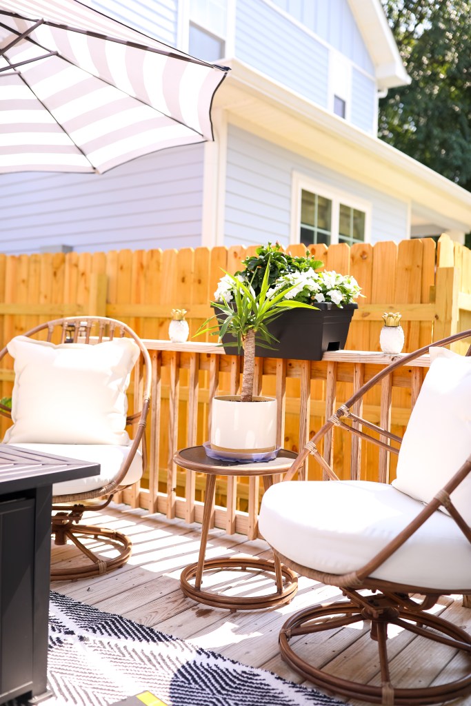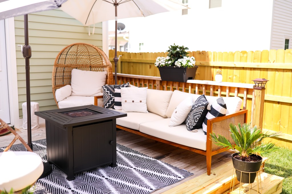 Furniture is necessary. For my design, I wanted to stick with neutral colors. You can’t go wrong when you start with this slate. We choose a sectional that we could take apart in case we needed to social distance with guests. In addition to the sectional, I bought a chair set in case we had a few more guests to entertain. To add some elevation and design to the deck, I added an Egg chair from Walmart. To keep your patio furniture safe, you’ll want to invest in a patio cover. Patio furniture is made for outdoors, but you still have to protect it. Invest in a deck box! You can toss the pillows in there when the bad weather rolls in.