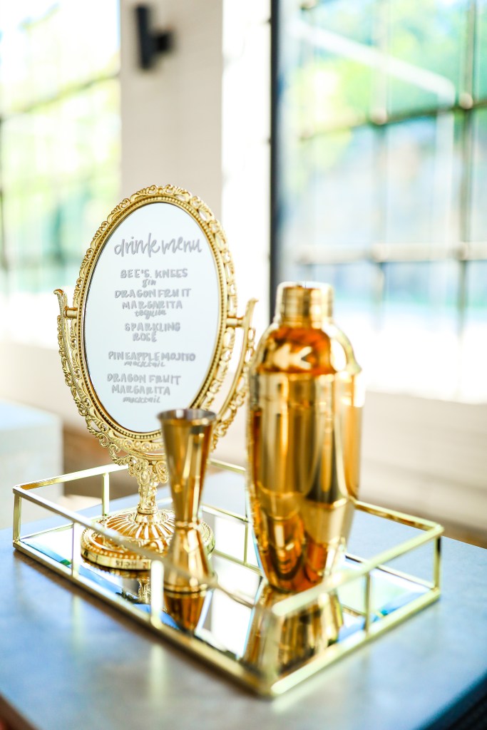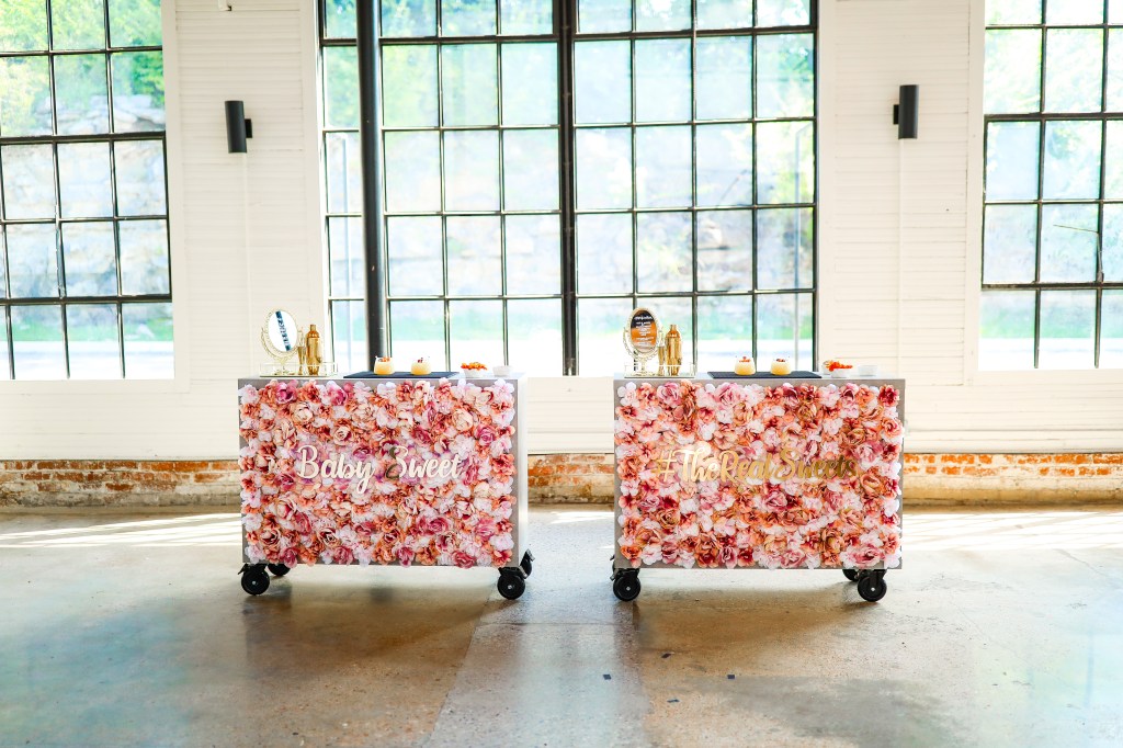 We’d used Cocktail & Key for our Gender reveal, and they were a hit! They created specialized drinks that fit the theme. We had mocktails for the little people and cocktails for the adults. The flower garnishes in the drinks mirrored the thematic approach. The bars were custom-designed with florals and signage hashtags that we’d used for our wedding, including (#TheRealSweets and #BabySweet.) They took care of each detail, from the mirror menus to the delicate drinks.