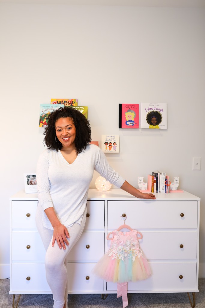 Ashley Furniture’s Baby & Toddler line offered an array of products to meet my vision. The acrylic convertible crib gave me an openness that I wanted myself and Reign to feel. No limits to those sweet dreams could be had in this sleeping space. The plush rocking chair was just what I needed to read children’s books of affirmation, heroism, and promise. I imagine keeping this chair forever and telling Reign all about our memories here. “Here, is where you took pictures every day after mom got you dressed.” “Here is where mom and dad laughed deliriously as we rocked you back to sleep.” The brass changing table is where the magic of Babydom happens with baby massages, diapering, etc. It’s where moms and dads literally watch the baby grow and change through diaper sizes and clothes. As the sun goes down, the Marlie floor lamp comes on illuminating the room just enough to soothe the soul. As mom is sorting through the drawers of the Finley dresser for the most comfortable nighties, Baby Reign is relaxing and stretching, and eventually crawling on the Surya floor rug. That’s it. That’s what I needed in my nursery to meet my vision.